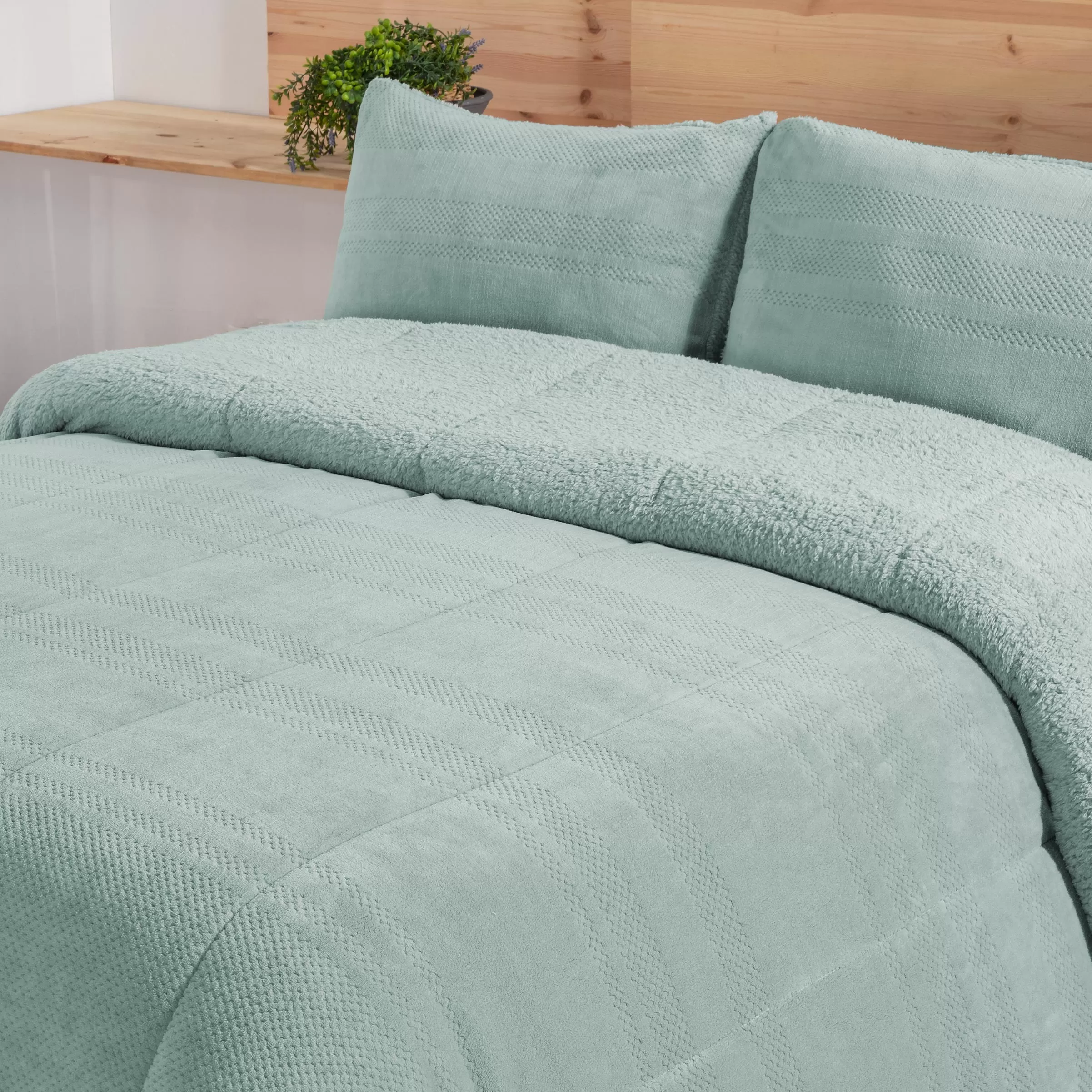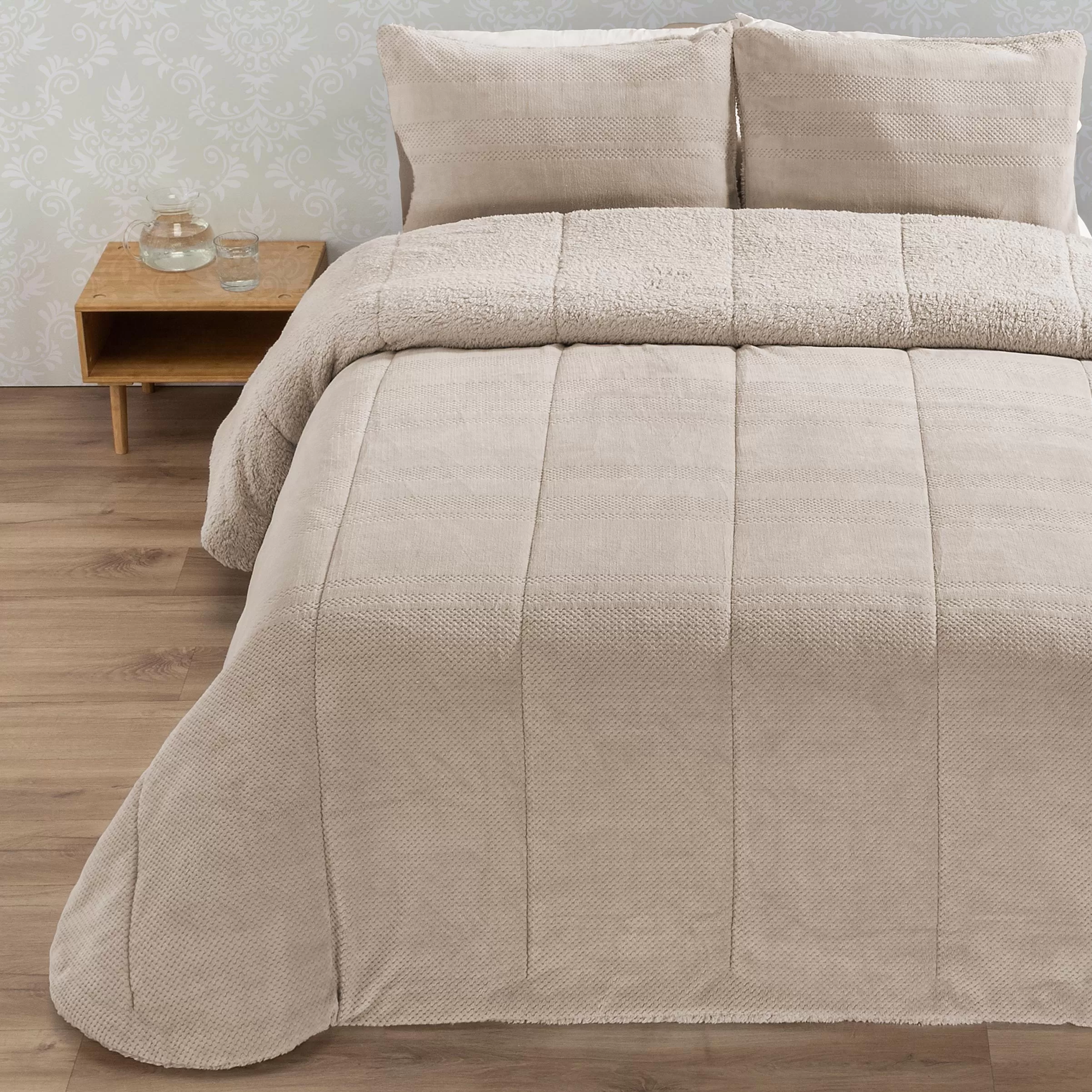 Confeccionado con una parte exterior de tacto extrasuave y un interior de sherpa mullida, ofrece un alto nivel térmico perfecto para las noches más frías. Incluye fundas de cojín a juego (50×70 cm) elaboradas con el mismo tejido para un conjunto armonioso y completo.