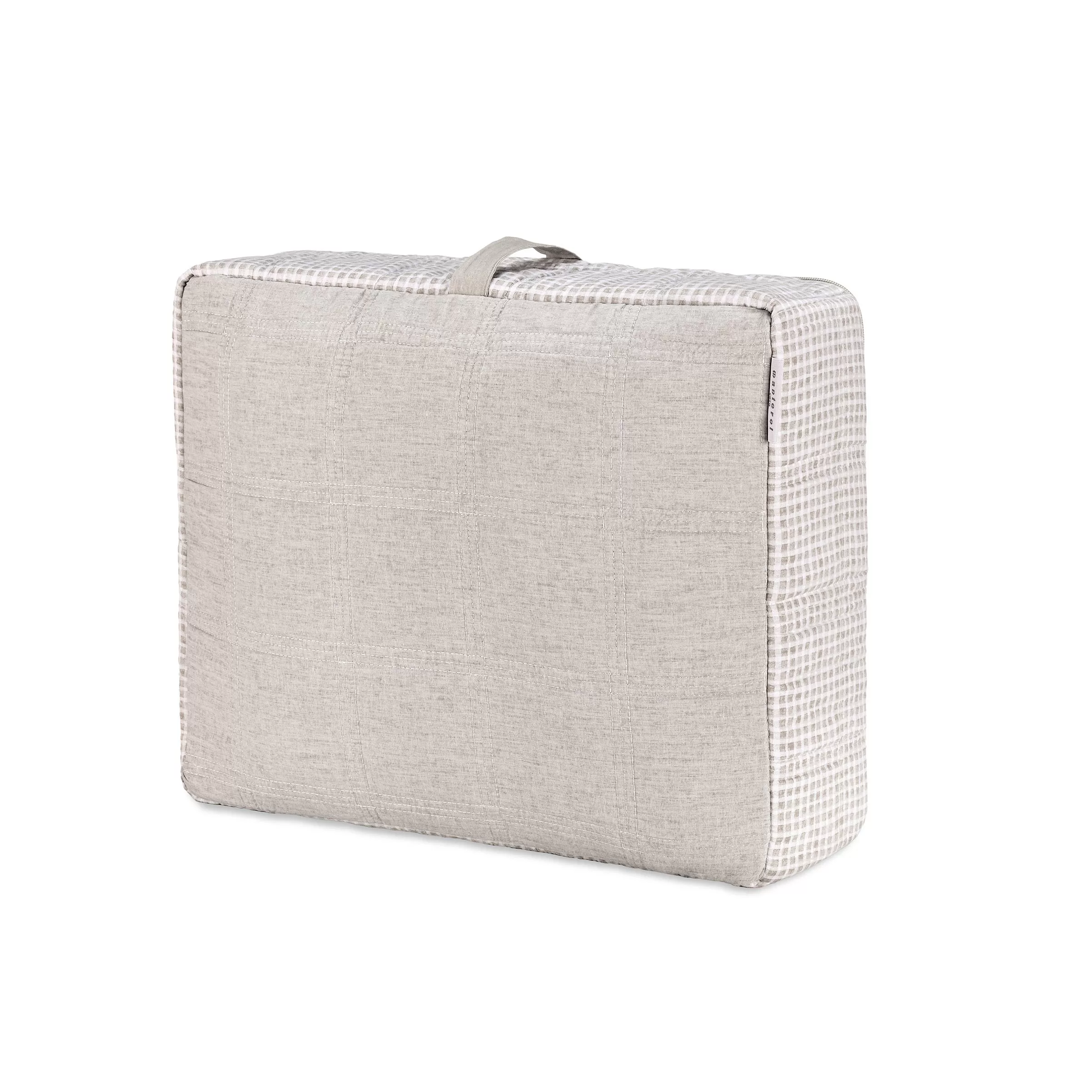 Además, forma parte de una colección sin plásticos y se presenta en un práctico organizador plegable, resistente y decorativo, ideal para guardar la colcha o utilizarlo como elemento multiusos.