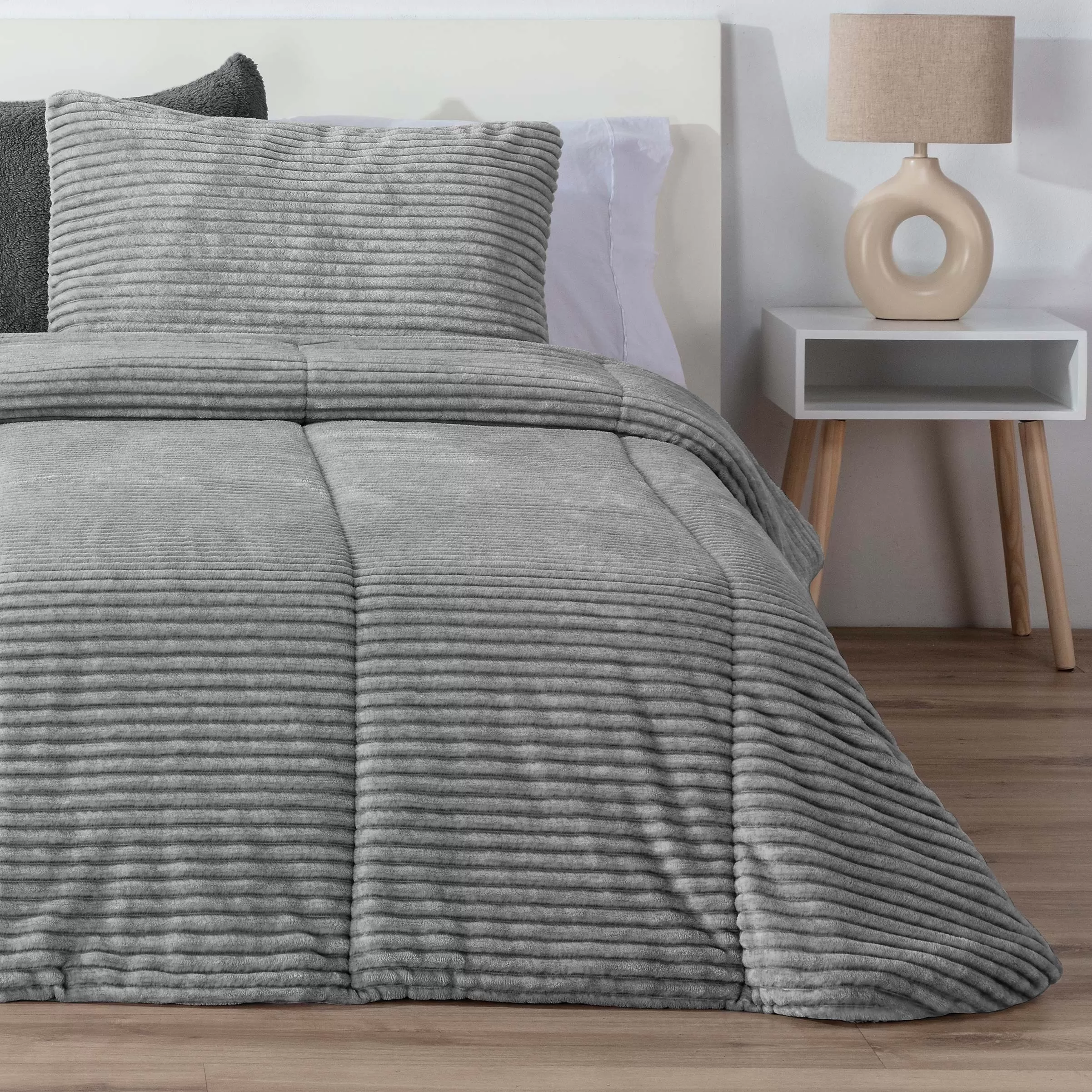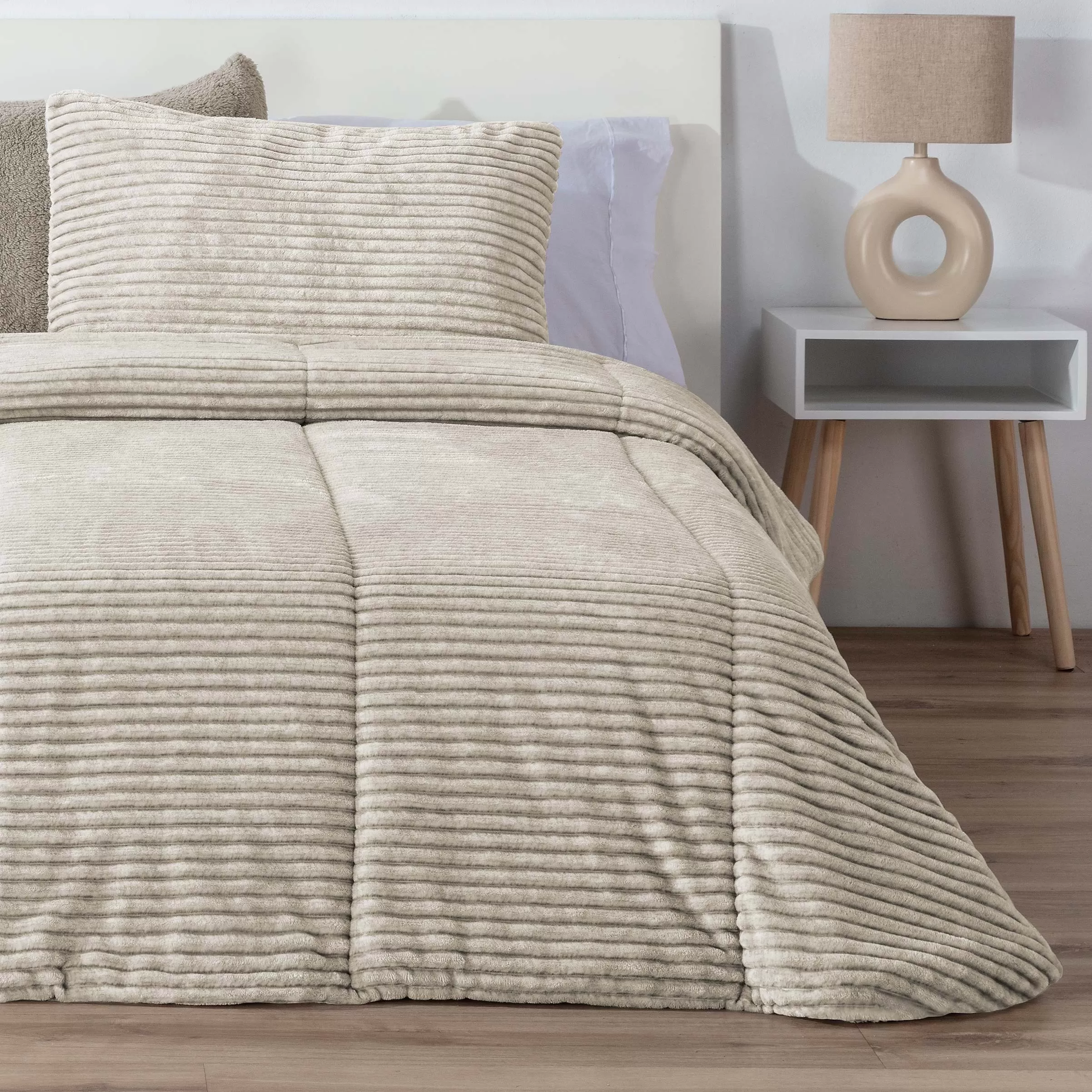 Edredón muy suave y cálido, ideal para los meses más fríos del año. Presenta un elegante relieve jacquard en la parte superior y un reverso en sherpa tintada, que aporta una textura mullida y una sensación envolvente de abrigo.